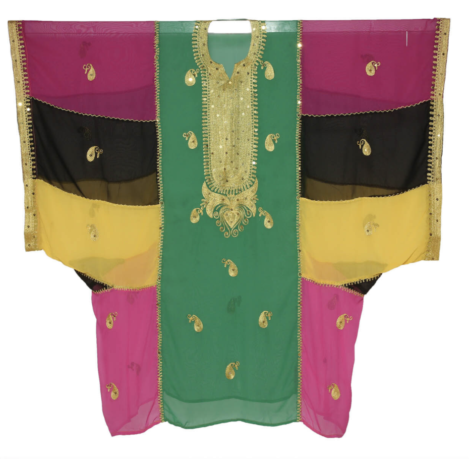 The thawb Thawb: (Arabic: thawb, Pl. Athwāb/thībān), can be pronounced thobe Thobe: (Arabic: thawb, Pl. Athwāb/thībān), can be pronounced thawb or tobe Tobe: (Arabic: thawb, Pl. Athwāb/thībān), can be pronounced thawb or thobe based on locale. The standard Arabic word for ‘fabric’ or ‘garment’. It can refer to a qamīs-like tunic worn by men and women in the Arabian Peninsula, Iraq, the southern and south-western ports and islands of Iran, and some countries in East and West Africa. More specifically, it can refer to the square-shaped Bedouin overgarment worn by women. based on locale. The standard Arabic word for ‘fabric’ or ‘garment’. It can also refer to a qamīs-like tunic worn by men and women in the Arabian Peninsula, Iraq, the southern and south-western ports and islands of Iran, and some countries in East and West Africa. More specifically, it can refer to the square-shaped Bedouin overgarment worn by women. or tobe Tobe: (Arabic: thawb, Pl. Athwāb/thībān), can be pronounced thawb or thobe based on locale. The standard Arabic word for ‘fabric’ or ‘garment’. It can refer to a qamīs-like tunic worn by men and women in the Arabian Peninsula, Iraq, the southern and south-western ports and islands of Iran, and some countries in East and West Africa. More specifically, it can refer to the square-shaped Bedouin overgarment worn by women. based on locale. The standard Arabic word for ‘fabric’ or ‘garment’. It can also refer to a qamīs-like tunic worn by men and women in the Arabian Peninsula, Iraq, the southern and south-western ports and islands of Iran, and some countries in East and West Africa. More specifically, it can refer to the square-shaped Bedouin overgarment worn by women in the Arabian Gulf region. msarah Msarraḥ:(Arabic: straight line, pl. sarāyiḥ), a traditional overgarment (thawb Thawb: (Arabic: thawb, Pl. Athwāb/thībān), can be pronounced thobe Thobe: (Arabic: thawb, Pl. Athwāb/thībān), can be pronounced thawb or tobe Tobe: (Arabic: thawb, Pl. Athwāb/thībān), can be pronounced thawb or thobe based on locale. The standard Arabic word for ‘fabric’ or ‘garment’. It can refer to a qamīs-like tunic worn by men and women in the Arabian Peninsula, Iraq, the southern and south-western ports and islands of Iran, and some countries in East and West Africa. More specifically, it can refer to the square-shaped Bedouin overgarment worn by women. based on locale. The standard Arabic word for ‘fabric’ or ‘garment’. It can also refer to a qamīs-like tunic worn by men and women in the Arabian Peninsula, Iraq, the southern and south-western ports and islands of Iran, and some countries in East and West Africa. More specifically, it can refer to the square-shaped Bedouin overgarment worn by women. or tobe Tobe: (Arabic: thawb, Pl. Athwāb/thībān), can be pronounced thawb or thobe based on locale. The standard Arabic word for ‘fabric’ or ‘garment’. It can refer to a qamīs-like tunic worn by men and women in the Arabian Peninsula, Iraq, the southern and south-western ports and islands of Iran, and some countries in East and West Africa. More specifically, it can refer to the square-shaped Bedouin overgarment worn by women. based on locale. The standard Arabic word for ‘fabric’ or ‘garment’. It can also refer to a qamīs-like tunic worn by men and women in the Arabian Peninsula, Iraq, the southern and south-western ports and islands of Iran, and some countries in East and West Africa. More specifically, it can refer to the square-shaped Bedouin overgarment worn by women in the Arabian Gulf region. ), adorned in vertical stripes on the sides, worn across the Arab gulf region. is defined by vertical embellished stripes along its sides, while the thawb Thawb: (Arabic: thawb, Pl. Athwāb/thībān), can be pronounced thobe Thobe: (Arabic: thawb, Pl. Athwāb/thībān), can be pronounced thawb or tobe Tobe: (Arabic: thawb, Pl. Athwāb/thībān), can be pronounced thawb or thobe based on locale. The standard Arabic word for ‘fabric’ or ‘garment’. It can refer to a qamīs-like tunic worn by men and women in the Arabian Peninsula, Iraq, the southern and south-western ports and islands of Iran, and some countries in East and West Africa. More specifically, it can refer to the square-shaped Bedouin overgarment worn by women. based on locale. The standard Arabic word for ‘fabric’ or ‘garment’. It can also refer to a qamīs-like tunic worn by men and women in the Arabian Peninsula, Iraq, the southern and south-western ports and islands of Iran, and some countries in East and West Africa. More specifically, it can refer to the square-shaped Bedouin overgarment worn by women. or tobe Tobe: (Arabic: thawb, Pl. Athwāb/thībān), can be pronounced thawb or thobe based on locale. The standard Arabic word for ‘fabric’ or ‘garment’. It can refer to a qamīs-like tunic worn by men and women in the Arabian Peninsula, Iraq, the southern and south-western ports and islands of Iran, and some countries in East and West Africa. More specifically, it can refer to the square-shaped Bedouin overgarment worn by women. based on locale. The standard Arabic word for ‘fabric’ or ‘garment’. It can also refer to a qamīs-like tunic worn by men and women in the Arabian Peninsula, Iraq, the southern and south-western ports and islands of Iran, and some countries in East and West Africa. More specifically, it can refer to the square-shaped Bedouin overgarment worn by women in the Arabian Gulf region. mkhawas Mkhawaṣ: (Arabic: khuṣ) meaning adorned with straw (khūṣ). Adding the letter (mīm) to the start of the word changes the meaning to ‘decorated with’. Also known as (mzarāī) or (mgaṣab). zari Zarī: (Persian two-syllables: zar: gold & dozi: embellishment), complex embroidery technique that uses metal alloy on silk, satin, or velvet, and may include pearls, beads, and precious stones. Coll
