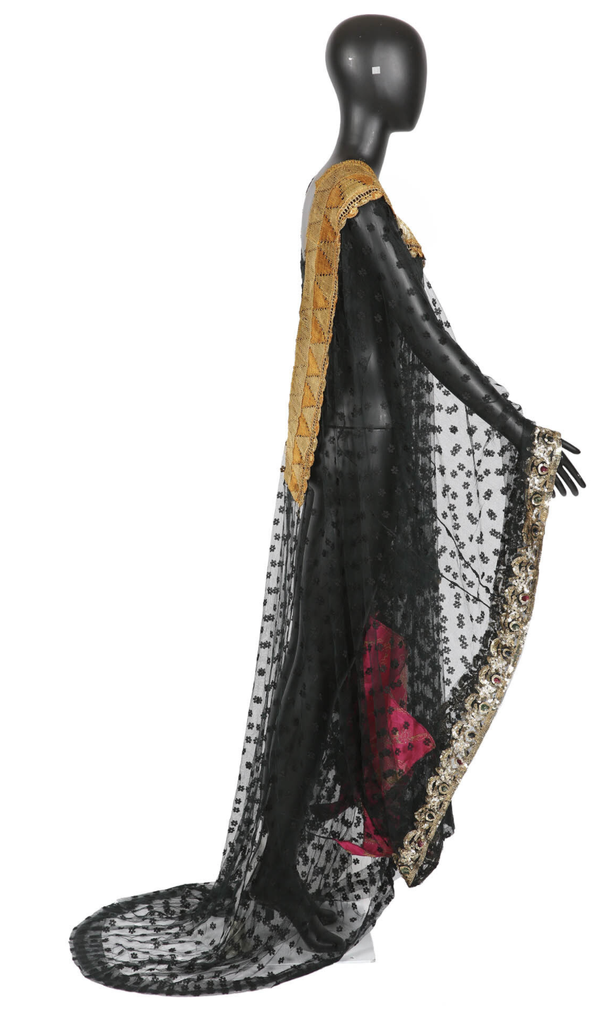 This garment is constructed from Point d’Esprit-style dotted tulle fabric, characterized by its delicate and airy design. Its loose silhouette and wide sleeves reflect the traditional aesthetics favoured by Gulf women.