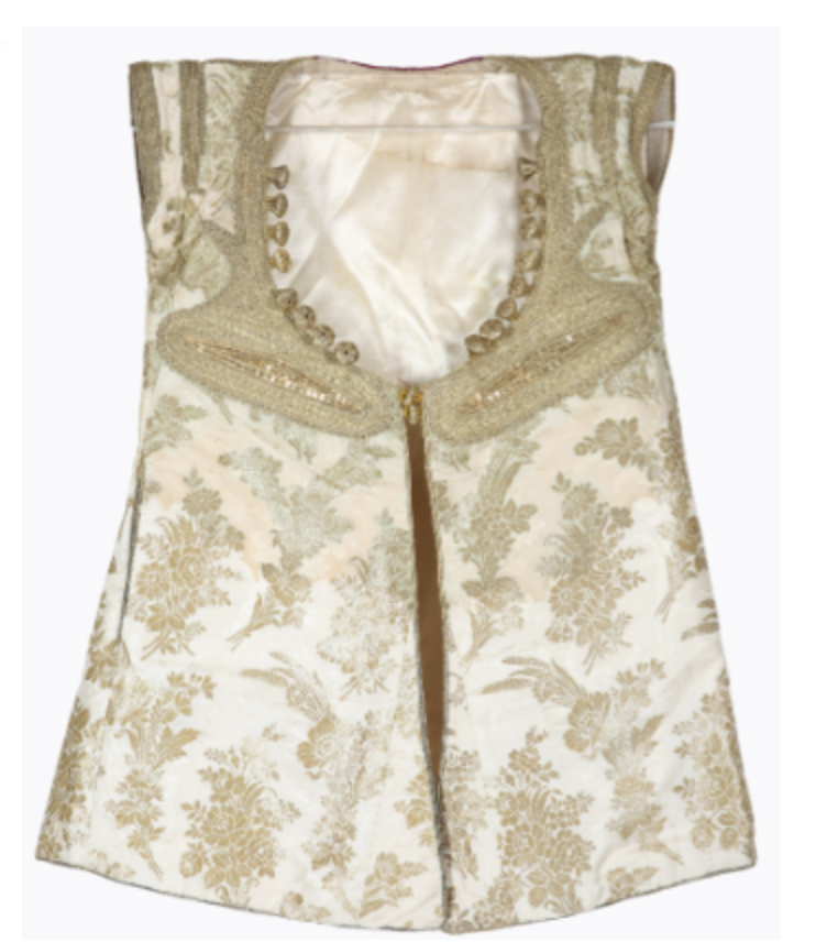 Metal embellished silk brocade Brocade: (Italian: brocco – twisted thread), is a richly decorative fabric woven with an intricate raised pattern. Its origins can be traced back to ancient China, where it was made for the imperial court. It later spread to Europe during the Renaissance and became popular in couture and decorative arts. vest, Algeria, c. 1900s; Acc No: ZI2021.500873 ALGERIA; The Zay Zay: (Arabic: costume, Pl. azyaā’), a set of clothes in a style typical of a particular country or historical period. Initiative