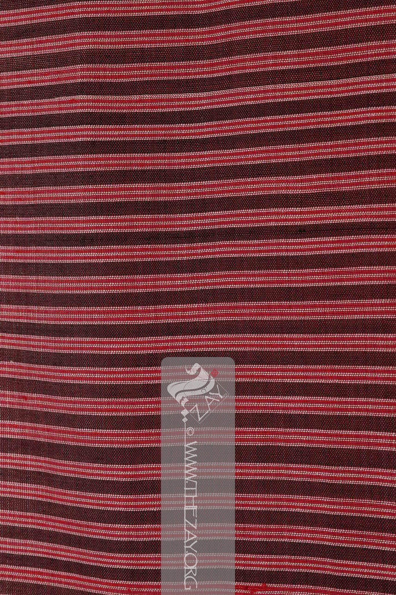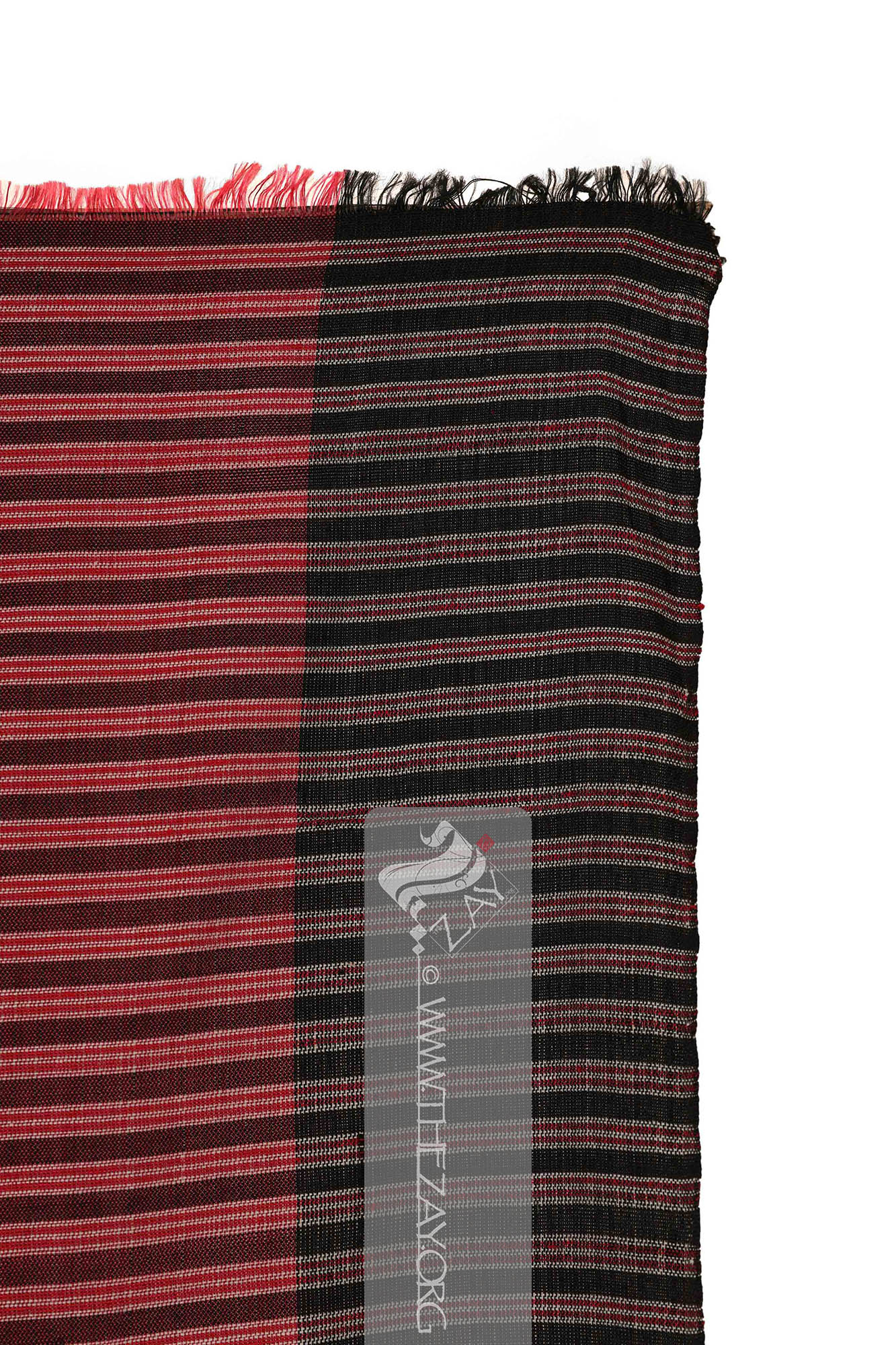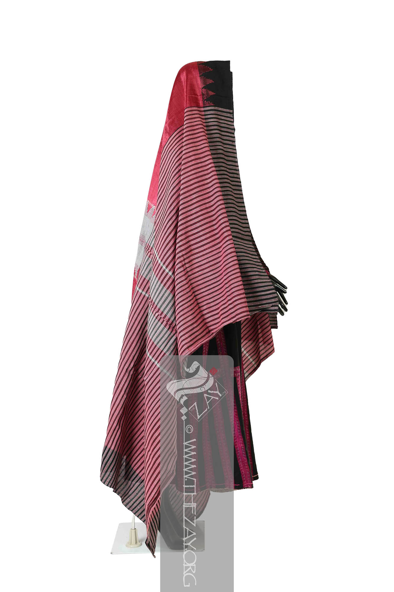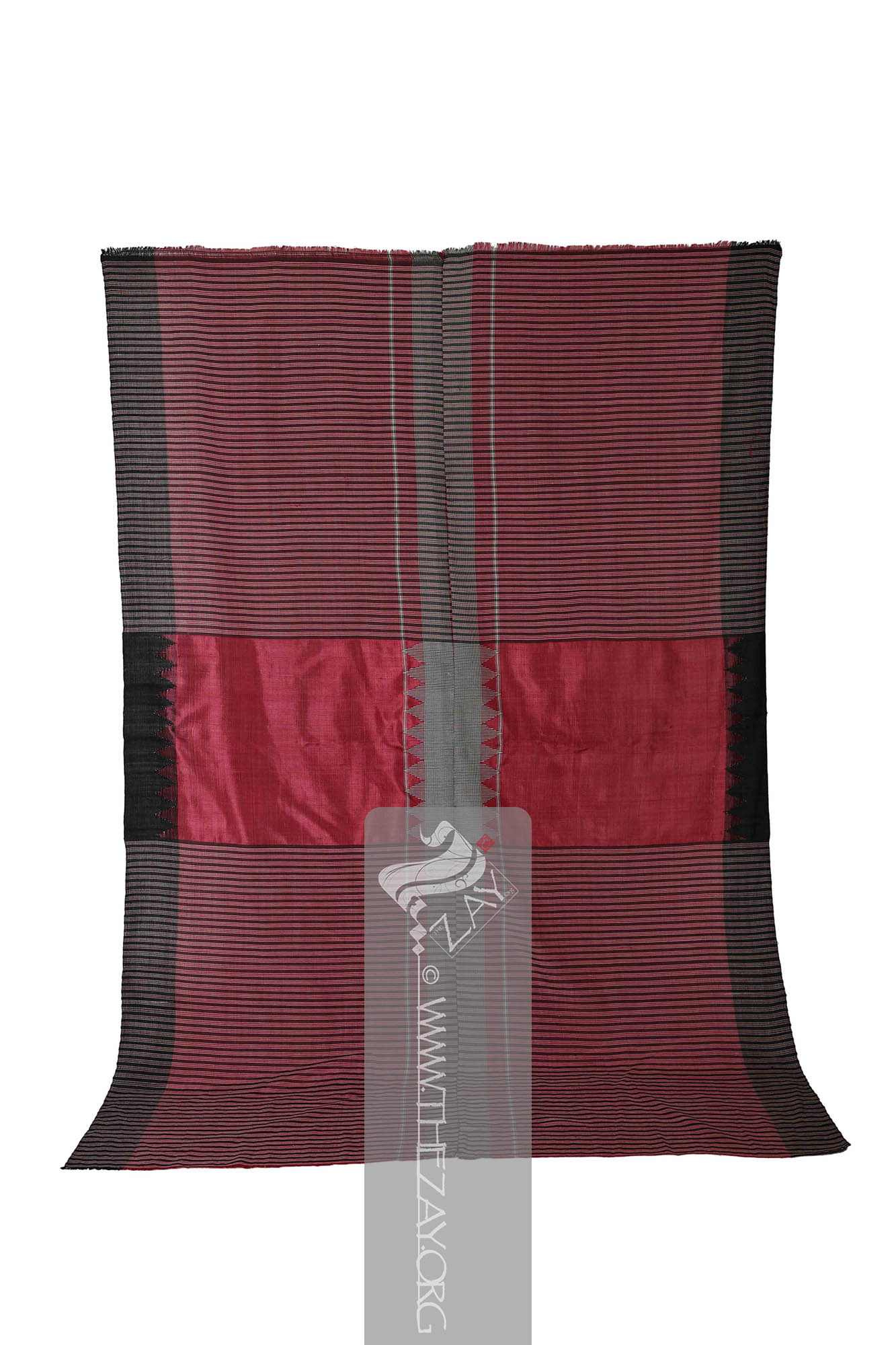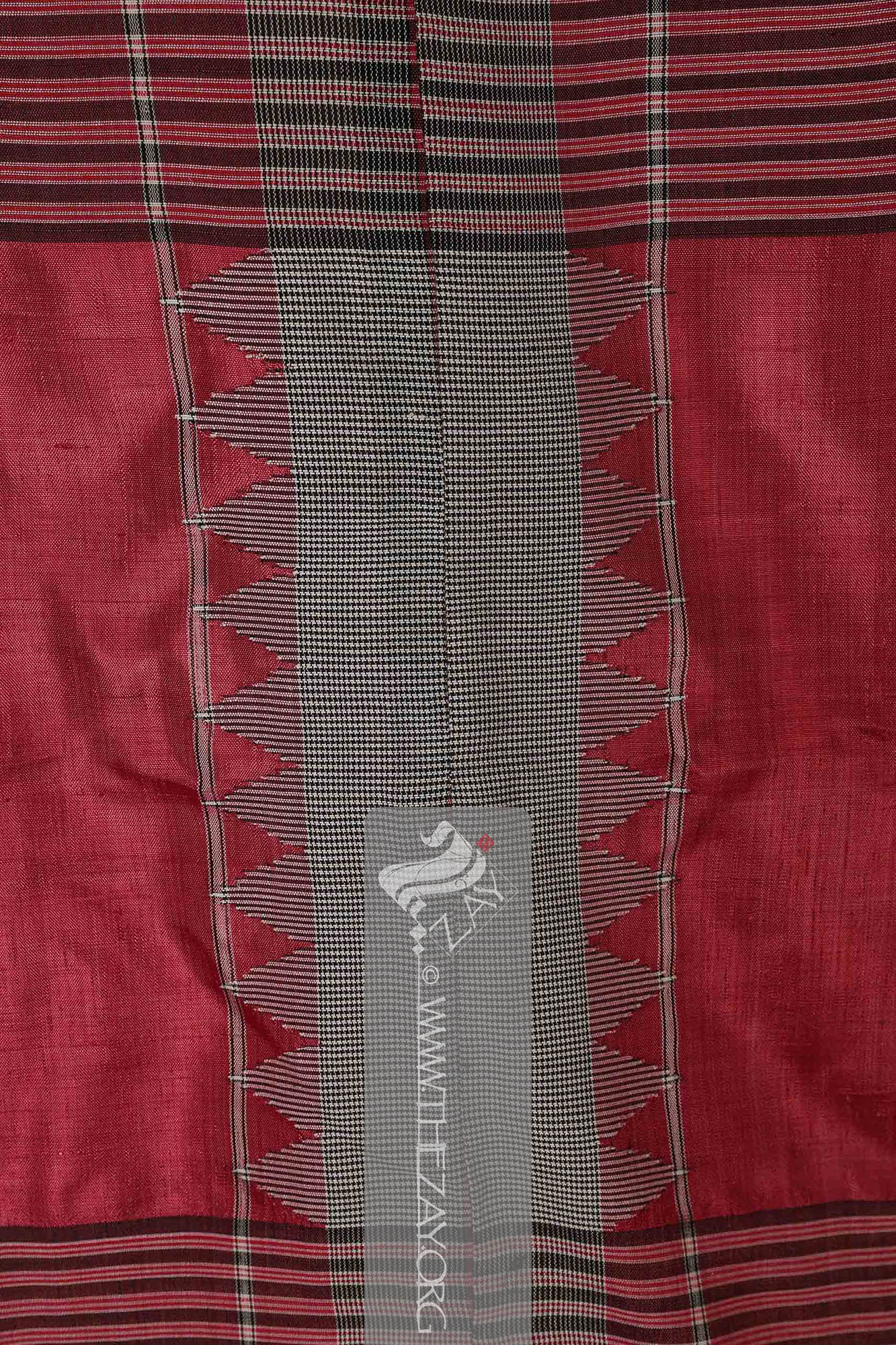 Each fabric is identically woven (selvedge Selvedge: (English: Self-finished edge or self-edge: a dialect forming transition), an edge produced on woven fabric during manufacture that prevents it from unravelling. Traditionally the term selvage applied to only loom woven fabric, presently it could be applied to flat knitted fabric too. ) to selvedge Selvedge: (English: Self-finished edge or self-edge: a dialect forming transition), an edge produced on woven fabric during manufacture that prevents it from unravelling. Traditionally the term selvage applied to only loom woven fabric, presently it could be applied to flat knitted fabric too. panel primarily with a central pink base with wide borders at the (warp Warp: One of the two basic components used in weaving which transforms thread or yarns to a piece of fabric. The warp is the set of yarns stretched longitudinally in place on a loom before the weft Weft: one of the two basic components used in weaving that transforms thread or yarns into a piece of fabric. It is the crosswise thread on a loom that is passed over and under the warp threads. is introduced during the weaving process. ) ends featuring pink, ivory, and black horizontally parallel stripes. The (weft Weft: one of the two basic components used in weaving that transforms thread or yarns into a piece of fabric. It is the crosswise thread on a loom that is passed over and under the warp threads.) ends also have broad borders but are different from the warp Warp: One of the two basic components used in weaving which transforms thread or yarns to a piece of fabric. The warp is the set of yarns stretched longitudinally in place on a loom before the weft Weft: one of the two basic components used in weaving that transforms thread or yarns into a piece of fabric. It is the crosswise thread on a loom that is passed over and under the warp threads. is introduced during the weaving process. . While one weft Weft: one of the two basic components used in weaving that transforms thread or yarns into a piece of fabric. It is the crosswise thread on a loom that is passed over and under the warp threads. end has a solid panel of black with woven repeats of a triangular pattern in red framing the central pink base, the other has an ivory and black chequered border with triangular patterns extending from it into the centre.