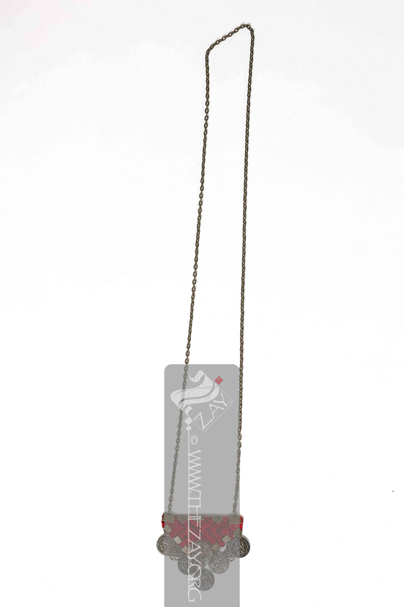 This is a woman’s neck ornament or necklace with a metal – possibly brass – chain. The pendant is made of a triangular-shaped felt embellished with red wool with possibly (buttonhole_stitch