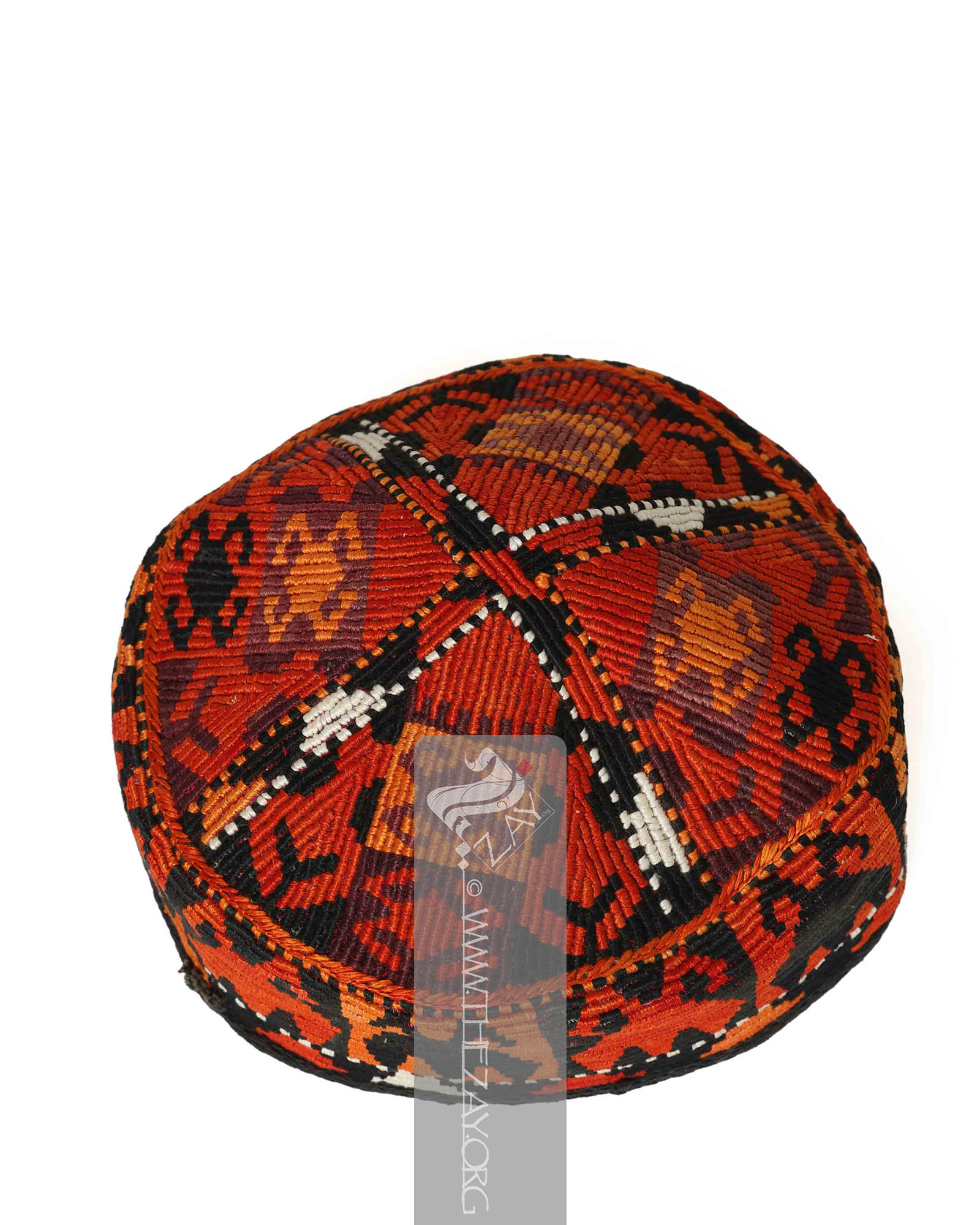 It is hand-woven in an array of colourful silk threads – orange, purple, black, yellow, and white – depicting abstract and geometric designs. It is very similar in style to the silk skull caps typical of Bokhara, Uzbekistan, which are far removed from the typical black skull caps Uzbek men.